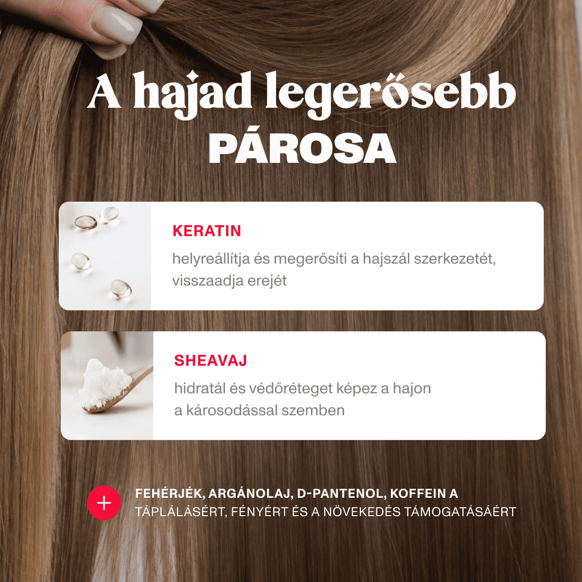 Argánolajjal, D-pantenollal és koffeinnel tovább erősítve a páros teljes körű regenerálást, táplálást és védelmet nyújt. Az eredmény: láthatóan erős, rugalmas és ragyogó haj, olyan hatással, amilyet csak a luxus szépségszalonban tapasztalsz.