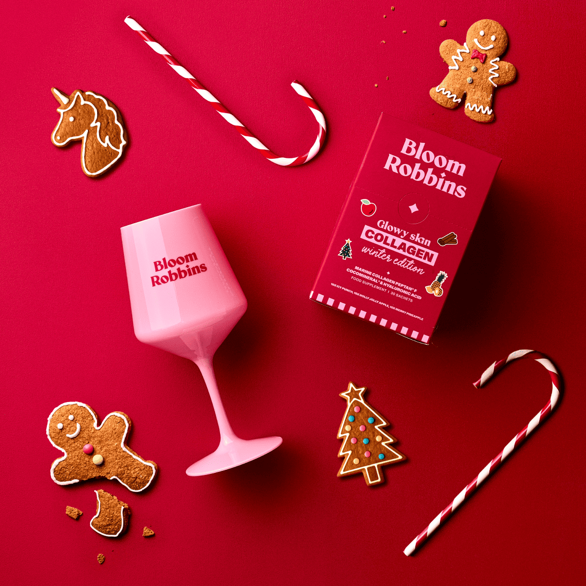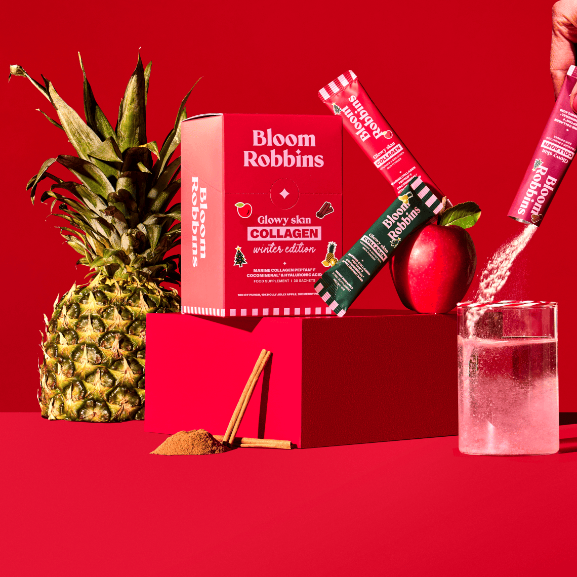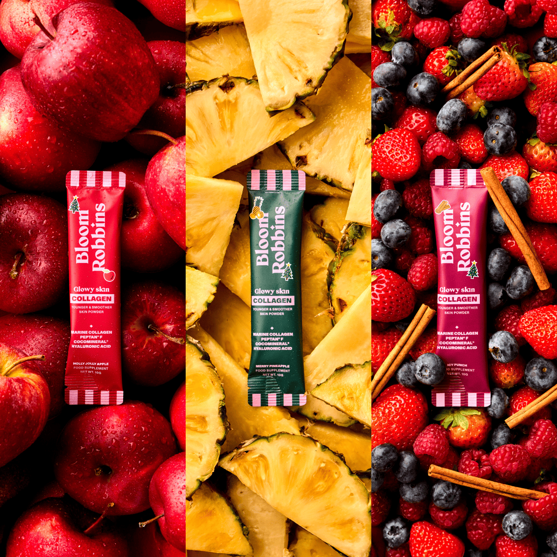 A dobozban egy limitált kiadású, 30 adagból álló kollagéncsomag rejtőzik: 10× ananász, 10× alma és 10× karácsonyi puncs ízben. A limitált kiadás kizárólag az ünnepi időszakban elérhető, és ha elfogy, többé nem lesz kapható.