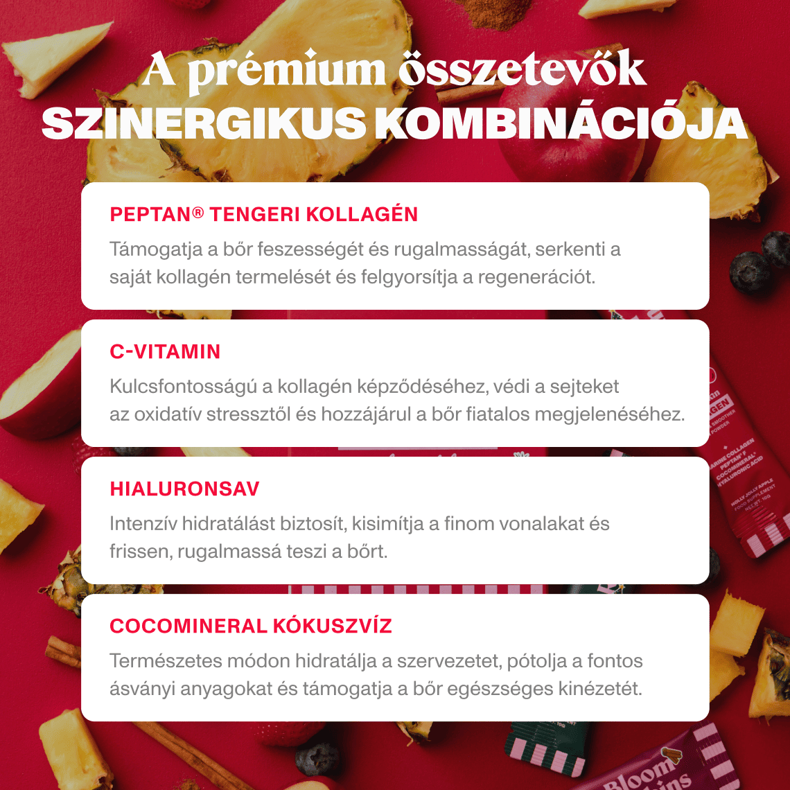 Peptan® hal kollagén peptidek, savanyúságot szabályozó anyag (citromsav), inulin, CocoMineral® kókuszvízpor, aroma, nátrium-hialuronát, C-vitamin (L-aszkorbinsav), céklakoncentrátum, édesítőszer (szukralóz)