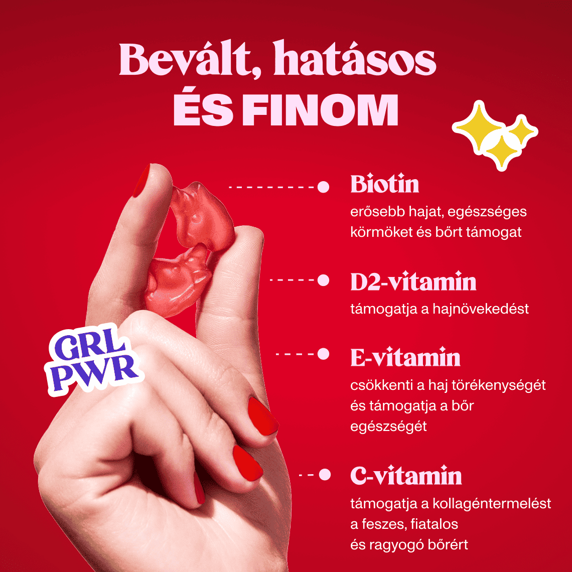 A gumicukor formájú hajvitamin az összes olyan vitamint, ásványi anyagot és elemet tartalmazza, amelyek elengedhetetlen a haj általános táplálásához, elősegíti a hajnövekedést, csökkenti a haj töredezését és a hajvégek szálkásodását, erősíti a hajat, fényt ad neki, csökkenti a hajhullást és a haj elvékonyodását.